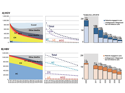 研究の結果、2015年時点の肝炎ウイルス持続感染者数は191~249万人(HCV:87~130万人、HBV:103~119万人)。また、持続感染者のうち、98万人(HBV:33万人、HCV:65万人)が患者として病院受診しているが、68万人(HBV:45万人、HCV23万人)は検査を受けておらず、25~83万人(HBV:25~42万人、HCV:0~41万人)は検査陽性の通知を受けたが、病院受診をしていないことが示された。