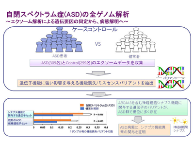 その結果、欧米の大規模エクソーム解析で同定されたASD候補遺伝子内の機能喪失バリアントが日本人ASDにおいても同定され、それらのバリアントを持つASD患者の表現型に強い影響を与えていることが示唆された。そして、機能喪失バリアントが生じにくい遺伝子セットや、シナプス機能に関与する遺伝子セット、FMRP(知的能力障害やASD症状を伴う脆弱X症候群の原因遺伝子となるFMR1によってコードされるタンパク質)がターゲットとする遺伝子セットが、健常者よりも統計学的に優位に多く存在することがわかった。また、シナプス機能のうち、特にトランスシナプスシグナル伝達(神経細胞間シナプスにおける、GABAやグルタミン酸などの神経伝達物質とその受容体を介した情報伝達機構)に関与する遺伝子セットが最も強い影響力を有していることが示され、ASDの新規病態解明につながることが期待された。さらに、約2万種類の遺伝子とASDとの関連を調べた結果、シナプス機能に関与するABCA13のASD発症への関与が示唆された。これら遺伝子の機能喪失バリアントを持つ患者は、ASDに加えてADHD傾向を有する可能性が高いことも示され、ASDとADHDの共通の病態解明につながる可能性を示した。