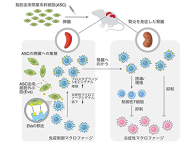 研究グループはさらに、EVsの移送によりマクロファージの免疫制御機能が強化され、同マクロファージは脾臓から循環血中へ入り腎臓へ到達することで、腎臓の修復に寄与していることを最新のイメージング技術・細胞機能解析から解き明かした。