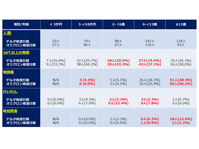 症状について、オミクロン株流行期は、デルタ株流行期に比べて2~12歳の患者で発熱やけいれんが、また、13歳以上の患者で咽頭痛が有意に多かったことがわかった。一方、6歳以上の患者の嗅覚・味覚障害はオミクロン株流行期には少なかったこともわかった。酸素投与を要した患者はオミクロン株流行期に多かったが、人工呼吸管理や集中治療室入院を要した患者の数、割合には大きな変化はなかった。