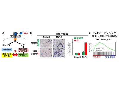 そこで研究グループは、細胞周期をモニタリングできるFucciシステムを用いてG1期に移行して増殖が低下した細胞とS/G2/M期に存在する増殖している細胞をFACSで分取して運動性試験とRNAシーケンシングを行ったところ、TGF-βにより増殖が停止した細胞の運動性が高く、EMTが誘導されていることを見出した。さらに、シングルセルRNAシーケンシングによる解析により、TGF-βにより誘導されるEMTには従来報告されていたHMGA2転写因子発現を介するものに加えて、細胞周期がG1期に停止した細胞を形成する新たな経路が存在することを見出した。