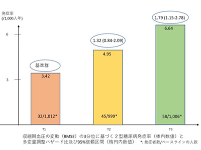 今回、研究チームは、研究代表者の八谷寛教授らが中部地方自治体職員を対象として実施している糖尿病等生活習慣病の追跡研究である愛知職域コホート研究のデータを使用。収縮期血圧(最高血圧)の長期変動と、その後約10年間の追跡期間中の2型糖尿病発症リスクとの関連を調べた。解析は、研究開始時に糖尿病のない3,017人を対象とし、うち135人が約10年間の追跡期間中に2型糖尿病を発症。血圧の長期変動の指標として(二乗平均平方根誤差「Root Mean Square Error:RMSE」)と追跡期間中の2型糖尿病の発症率との関係を、変動に関連し2型糖尿病発症率にも関連するかもしれないその他の因子(交絡因子)である性別、年齢、喫煙及び運動習慣、食塩摂取量、肥満度、糖尿病の家族歴、追跡開始時の血糖値等の影響を統計学的な方法により調整して検討した。