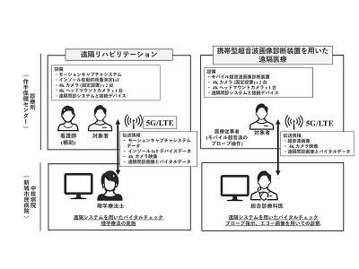 過疎地域の中核病院と山間部の診療所の間で、5G通信システムを用いて、携帯型超音波画像診断装置を使用した遠隔医療、および遠隔リハビリテーションを実施した。遠隔医療では、診療所にいる検査技師が模擬患者を対象に携帯型超音波のプローブを操作し、中核病院に医師に滞在する医師がプローブの操作など、検査における指示と観察を行った。遠隔リハビリテーションでは、中核病院の理学療法士が、地域住民5人を対象としてリハビリテーションを実施。両実証において、5GとLTEのそれぞれで、医師または理学療法士が映像の質と伝送遅延への主観的評価を行った。