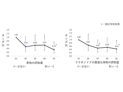 今回の研究では、1995年と2000年に行った2回の食事調査アンケートに回答があり、かつ2014~2015年にかけて実施した「こころの検診」に参加した1,204人を対象とした。2回のアンケートから、野菜、果物およびフラボノイドの豊富な果物の摂取量の平均値を計算し、それぞれについて人数が均等になるよう5グループに分け、摂取量が最も少ないグループを基準とした場合の、他のグループのうつ病発症リスクとの関連を調べた。