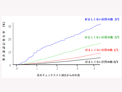 研究の結果、基本チェックリスト調査結果より、4年後の要介護認定の累積発生率は、回答しなかった人の方が回答した人よりも高くなった(12.5%対8.4%)。また、回答者のうち、3つの質問に対して、好ましくない回答が多いほど、要介護認定の発生率が高くなった(好ましくない回答の数が0、1、2、3の回答者は、それぞれ4年後の時点で5.0%、8.4%、15.7%、30.2%)。同様に、認知機能低下を伴う要介護認定に限定した場合でも、好ましくない回答が多いほど、要介護認定の発生率が上昇した(好ましくない回答の数が0、1、2、3の回答者は、3.4%、6.5%、13.7%、27.9%)。