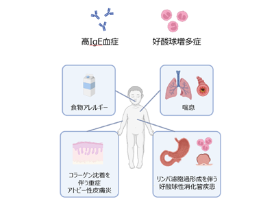 一般的にアレルギー性疾患は、環境要因を含むざまざまな外的な要因と、遺伝的素因が複雑に絡み合って発症する多因子疾患と考えられている。その病態は、外的要因により活性化された細胞から産生されるインターロイキン(IL)-4/13がSTAT6を活性化することが中心であると考えられている。一方で、近年の遺伝学および解析技術の発展にともない、生後早期から発症する疾患や重症の炎症を伴う疾患の中には、たった一つの遺伝子の異常で発症する「単一遺伝子疾患」が存在する可能性が示唆されるようになった。