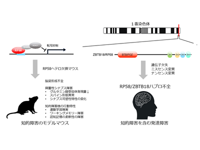 知的障害は発達期に生じる障害で、知的能力と適応能力に制約を伴う状態であり、人口の1〜3%が何らかの障害を有していると考えられている。環境、栄養、外傷、代謝、中毒などさまざまな原因があるが、遺伝子変異、染色体異常という先天的な原因で生じるケースも多く、例えば、1q43-44微小欠失症候群では、その責任遺伝子の一つとして転写抑制因子RP58が同定されている。また、近年、知的障害の患者の中からRP58遺伝子自体の変異も同定されている。これらの患者では、RP58の機能が減弱していることが想定される。さらに、RP58のナンセンス変異の患者が知的障害を示す症例が報告され、RP58ハプロ不全が知的障害の原因になることが明らかとなった。