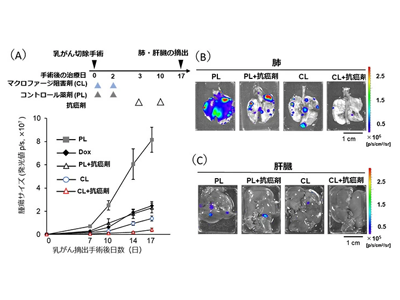 多様なマクロファージがある中で、研究グループは乳腺組織に常在するマクロファージが乳がん細胞の増殖の初期段階を手助けしていることを見いだし、がん細胞には作用しないマクロファージ阻害薬(CL)を用いて、乳腺に常在するマクロファージを死滅させたところ、TNBC増殖が顕著に抑制された。この実験結果をもとに、TNBCの術後再発および転移に対するマクロファージ阻害の影響を検討した。具体的には、まずマウスの乳房にTNBC細胞を移植後、腫瘍の大きさが1cmに達したとき、その95%を切除し、乳がんの再発モデルとした。そのモデル(各治療群8匹)を用いてTNBCの増殖および他の臓器の転移におけるマクロファージ阻害の効果を検討したところ、マクロファージ阻害によって、TNBCの増殖および肺や肝臓への遠隔転移が顕著に抑えられることがわかった。さらに、汎用されている抗がん剤と併用して、マクロファージとがん細胞を同時に攻撃したところ、さらなる抑制効果が観察された。