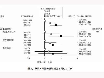 平均5.7年間の追跡調査中に、561人が死亡。野菜・果物の摂取頻度が少ないほど、死亡リスクは増大し、毎日摂取していた人に比べて、時々食べる人は1.25倍(95%信頼区間1.04-1.52)、ほとんど食べない人は1.60倍(95%信頼区間1.23-2.08)だった。CKD状態別に検討を行ったところ、保存期CKDや血液透析の患者群では人数が少なく有意ではなかったが、同様の関連が見られたという。