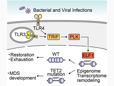 また、がんが発症する仕組みとして、微生物由来の産物を感知するToll-like receptor(TLR)と、その下流にあるTRIF-PLK-ELF1転写因子の経路が活性化することで、造血幹細胞にエピゲノム(クロマチン構造)の変化が起き、そこに、微生物暴露の前ではなく、暴露後にTET2遺伝子変異が起きることで、骨髄異形成症候群が発症することが判明した。