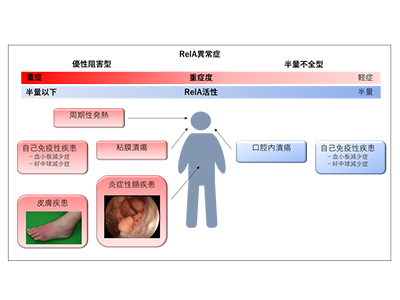 原発性免疫不全症は400種類以上の病型が知られており、免疫系の異常により易感染性、自己炎症、自己免疫症、アレルギーなどさまざまな病態を起こす。その中で「RelA異常症」は、反復する皮膚・粘膜潰瘍を生じる4人の患者から2017年に同定された疾患だ。RELA遺伝子にコードされている転写因子RelAは、NFκBシグナル経路の重要な因子で、サイトカインなどの刺激により活性化し、炎症や細胞増殖に関連する遺伝子群の働きを調節することで免疫反応の制御を行う。RELA 遺伝子の変異のうち、半量不全をきたす変異では皮膚や粘膜に潰瘍をつくる軽度の自己炎症疾患を引き起こすことが知られていたが、自己免疫性の血球減少や炎症性腸疾患など重症化する病型の原因は不明だった。