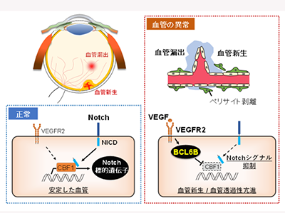 血管が脆くなる、異常な血管新生が生じるなどの原因タンパク質としてvascular endothelial growth factor(VEGF)が同定されている。臨床においても、VEGFシグナルを制御する治療戦略が眼血管病態に対して奏功することが明らかになっている。しかし、眼の血管病変の発症や進展は非常に複雑で、VEGF以外のシグナルも関与していることが報告されている。そこで今回、研究グループは、細胞内のタンパク質BCL6Bに着目した研究を進めた。