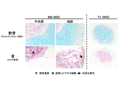 さらに、軟骨スフェロイドを生体内に移植した際に、その性質が維持されるか確かめた。T1-iMSCあるいはBM-MSCから作製した軟骨スフェロイドを免疫不全マウスの皮下に移植。8週間後に移植したスフェロイドを採取し、顕微鏡で観察した。