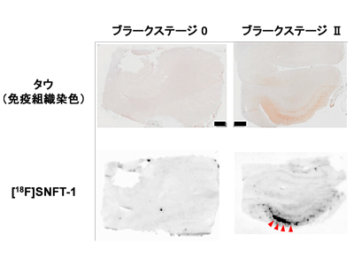 [18F]SNFT-1の病変検出感度について詳しく調べるため、認知症症状がないにもかかわらず、初期のアルツハイマー病の病理所見を示した高齢者の死後の脳病理組織標本を用いて評価を行った。その結果、タウ病理の重症度としてはごく軽度に相当するブラークステージIIの脳標本でも、[18F]SNFT-1はタウ病変を明瞭に描出した。また他のタウPETトレーサーと比べて、[18F]SNFT-1はタウ結合部位におけるシグナル強度が最も高く、従来型トレーサーよりも優れた感度でタウを検出できる可能性が示唆された。さらに[18F]SNFT-1は、正常マウスに対して静脈内投与した際に、高い脳内取り込みと急速なウォッシュアウトを示したことから、PETトレーサーとして優れた性能を発揮するものと期待される。
