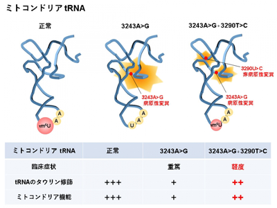 ミトコンドリアDNAの解析結果から、軽度の臨床症状を示す患者にはtRNAの遺伝子内部に病原性変異3243A>Gに加えてもう1つの非病原性変異3290T>Cが共通して存在することを見出した。