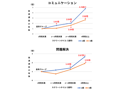 その結果、1歳時でスクリーンタイムが1時間未満の子ども(基準グループ)と比較して、スクリーンタイムが4時間以上の子どもでは2歳時、4歳時のコミュニケーション領域における発達の遅れがある割合がそれぞれ4.78倍、2.68倍と推定された。また、基準グループと比較して、スクリーンタイムが4時間以上の子どもでは2歳時、4歳時の問題解決領域の発達の遅れがある割合がそれぞれ2.67倍、1.91倍と推定された。