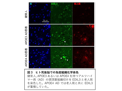 興味深いことに、EDIL3に対する抗体を用いたヒト死後脳の免疫組織化学染色により、APOE4遺伝子型を持つアルツハイマー病患者では、EDIL3の顕著な蓄積が見られた。EDIL3はアルツハイマー病の神経病理のひとつである老人斑形成に関与する遺伝子としてゲノムワイド関連解析で同定されていた。したがって、これまで別々にアルツハイマー病と関与が示唆された遺伝子であるAPOE4とEDIL3の関連性が示唆された。
