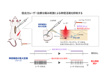 研究では、成熟ラットの脊髄後角に記録電極を刺入し、皮膚に機械刺激を加えることで脊髄後角の神経細胞の発火を記録した。機械刺激を加えるため、決まった圧力を加えることのできるvon Freyフィラメントを使用し、痛み刺激にあたる太いフィラメント、痛みと感じない弱い刺激(触刺激)にあたる細いフィラメントを使用した。波長808nmの半導体レーザーを使用し、臨床の使用方法と同様に、経皮的にレーザーを照射した。次に、成熟ラットの坐骨神経にフォトダイオードセンサを埋め込み、経皮的にレーザーを照射することで、レーザーが坐骨神経に到達するのか検証した。