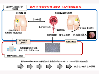 今回の研究は、再生医療等の安全性の確保法等に関する法律において求められる第二種再生医療計画のもと施行されている。脂肪幹細胞を患者の皮下脂肪組織から取り出し、細胞加工施設で一定数の脂肪幹細胞まで増やして(培養)、再び患者の体(括約筋部)に戻す。培養するため、患者から取り出す脂肪組織は少量で済み、体型に関係なく同量かつ大量の脂肪幹細胞を作ることができる(規格化)が利点として挙げられる。