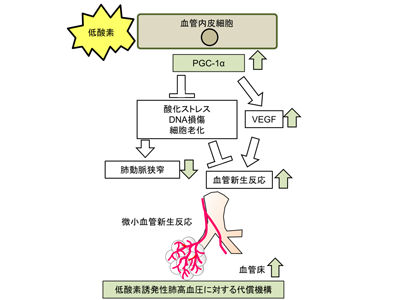VEGFシグナルおよび血管新生の上流に位置するHIFの活性化が低酸素負荷誘発性肺高血圧を悪化させることはすでに報告されていたため、研究グループは、HIFとは独立した血管新生因子PGC-1αに着目した。PGC-1αは低酸素負荷誘発性肺高血圧症モデルマウスの血管内皮細胞で発現が上昇し、SU5416ならびにカボザンチニブの投与により抑制されるなど、VEGFと同様の発現パターンを呈することから、血管新生反応の上流に位置することが示唆された。