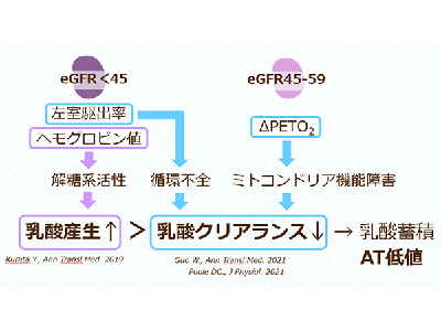 ATは腎臓病の重症度が高いほど統計学的にも低値を示した(<45群:10.9±2.1 vs 45~59群:12.4±2.5 vs ≥60群:14.0±2.6, p <0.001)。腎臓病の重症度別にAT低値の原因を求めた統計解析の結果、eGFR<45群(重度の腎臓病)では、ヘモグロビン値と左室駆出率、eGFR45-59群(中等度の腎臓病)では、ΔPETO2(安静時からATまでの呼気終末酸素分圧の変化量)がAT低値の原因となった。 ATは、乳酸産生が乳酸クリアランスを上回り、乳酸の蓄積が始まるポイントだ。eGFR<45群におけるヘモグロビン低値、つまり、貧血は解糖系活性を引き起こし過剰に乳酸を産生させる。また、左室駆出率低下は心臓から拍出される血液量が減少するため、循環不全となり乳酸クリアランスを低下させる。乳酸産生が過剰な状態にあるにも関わらず、乳酸クリアランスも低下することから、乳酸蓄積が促進されAT低値につながると考えられた。 一方、eGFR45-59群においては、ΔPETO2低値は骨格筋のミトコンドリア機能障害を反映する可能性があることから、ミトコンドリア機能障害が乳酸クリアランスを低下させることが、乳酸蓄積を促進し、AT低値につながっていると考えられた。