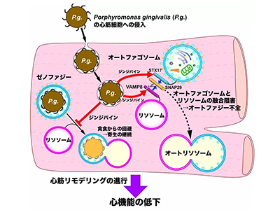 東京医科歯科大学は9月21日、歯周病原細菌「Porphyromonas gingivalis(P.g.)」から放出されるプロテアーゼであるジンジパインがオートファゴソームとリソソームの融合に必須の分子VAMP8の分解を介してオートファジーを抑制することにより、心筋梗塞後のリモデリング悪化作用を発揮していることを発見したと発表した。この研究は、同大大学院医歯学総合研究科循環制御内科学分野の前嶋康浩准教授と渡辺由佳非常勤講師(日本学術振興会特別研究員RPD)の研究グループによるもの。研究成果は、「International Journal of Oral Science」に掲載されている。