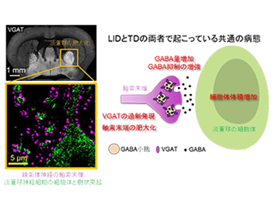 まず、LIDモデルマウスとTDモデルマウスに共通する脳構造異常を探索した。その結果、いずれの病態においても線条体神経細胞の軸索末端が肥大すること、投射先でシナプス接続する淡蒼球神経細胞体が肥大することを発見した。軸索末端の肥大は、線条体神経細胞における「GABAトランスポーター(vesicular GABA transporter:VGAT)」の発現増加と相関していたという。