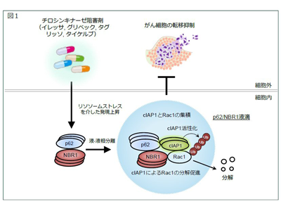 イレッサ、グリベック、タグリッソ、タイケルブは、それぞれ特定のチロシンキナーゼを特異的に抑制する分子標的薬としてがん治療に活用されている。今回の研究により、これらのTKIsは、本来の標的であるチロシンキナーゼの抑制とは全く別のメカニズムでがん細胞の転移を抑制することが明らかとなった。つまり、これらのTKIsは、現在の適応だけでなく、多種多様ながんの遠隔転移を抑制する転移抑制剤として転用できる可能性がある。また、cIAP1は遺伝子増幅によりがん細胞で発現量が増えることが報告されている。cIAP1の発現量が高いがん細胞は、抗がん剤に耐性を示すことが多く、転移の危険性の高いがんと言える。従って、TKIsによる転移抑制作用は、転移の危険性の高いがんにこそ有効である可能性がある。「研究の成果は、p62/NBR1液滴を介した転移抑制という、全く新しいコンセプトを持つ革新的な転移抑制剤の開発につながることが期待される」と、研究グループは述べている。