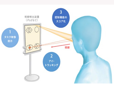 今回承認されたミレボは、タスク映像における被検者のアイトラッキング(視線計測)データをアルゴリズム処理し、スコア化する。タブレット端末にApp Storeからインストールしたアプリ「ミレボ」を使用することで、約3分間で簡便に検査を実施できる。画面に表示される質問に沿って被検者が正解の箇所を見つめることにより、データを自動的にスコア化し、定量的かつ検査者の知識や経験に依存せず客観的に評価することが可能になる。