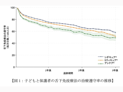結果、治療遵守率は、1年目で75.6%、2年目で61.5%、3年目で53.9%であり、欧州の先行研究と同等かそれ以上だった。治療遵守率をSLIT製剤別では、「シダキュア」、「ミティキュア」、「アシテア」の順に高い傾向がみられた。年齢別で見ると、小児では10代の遵守率が、保護者では20〜30代の遵守率が低い傾向にあった。