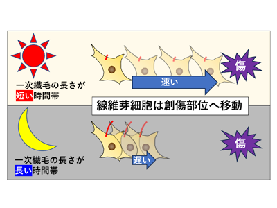 線維芽細胞が傷ついた部位(創傷部位)へ移動する速度を測定する創傷治癒アッセイ(Wound healing assay)を行ったところ、一次繊毛の長さが最も長い時間帯の傷に面した線維芽細胞では一次繊毛の長さが最も短い時間帯に比べ創傷部位への移動速度が低下することを明らかにした。