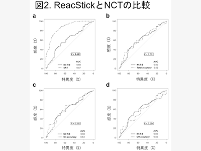 次に、肝硬変患者の神経機能の特徴を明らかにするため、また、ReacStickと肝硬変患者の神経機能検査法として一般的なNCT-Bを比較してどちらがより肝硬変患者の神経機能を特徴づけるのに優れているかを調査するために、Receiver operating characteristic(ROC)解析を行った。ROC解析によるarea under the curve(AUC)ではReacStickで測定したSRTがNCT-Bと比較してより大きなAUCを有し、肝硬変患者を抽出するのにより優れた検査であることが明らかとなった(AUC, 0.87 vs 0.60;P < 0.001)。一方で、NCT-BとRAの比較ではAUCの大きさに有意差を認めなかった。以上の結果から、肝硬変患者の神経学的特徴は刺激に対する反応速度の低下が最も顕著な特徴として抽出され、従来の神経機能検査法であるNCT-Bよりもより優れた精度で肝硬変患者を特徴づけることが可能であることが明らかとなった。