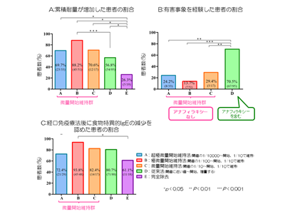 研究の結果、A~C群の微量開始維持群は、D群の従来法よりも有害事象を経験した人数の割合が有意に少なく(A群24.2%、B群13.7%、C群29.4% vs. D群70.5%)、微量開始維持群のほとんどすべての有害事象が口やのどのかゆみなどの軽微な症状であり、アナフィラキシーは認められなかった。しかし、D群の従来法では、アナフィラキシーを含むアレルギー症状が認められた。またB群の極微量開始維持法はD群の従来法よりも2回目の食物経口負荷試験の閾値上昇人数の割合が高く(B群88.2% vs. D群56.8%)、食物特異的IgE値が上昇した人数の割合は、B群の極微量開始維持法(93.8%)がE群の完全除去(61.1%)より多かったということがわかった。 以上から、従来法よりも微量開始維持群の安全性と極微量開始維持法の有効性が示された。