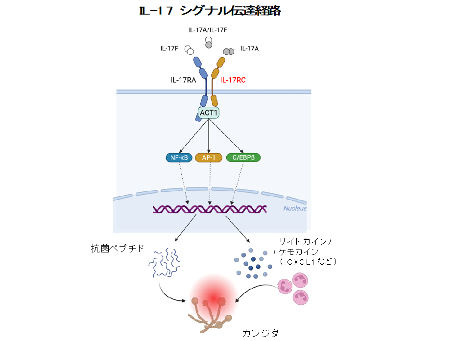 IL-17RCはIL-17の受容体ファミリーの一つで、IL-17RAと二量体を形成してIL-17に対する受容体として機能する。IL-17がこの受容体に結合すると下流の分子群が活性化され、ディフェンシンなどの抗菌ペプチドや、CXCL1やCXCL8、IL-6などの炎症性ケモカイン/サイトカインが産生される。これらが免疫系を活性化することにより、最終的にカンジダは排除される。