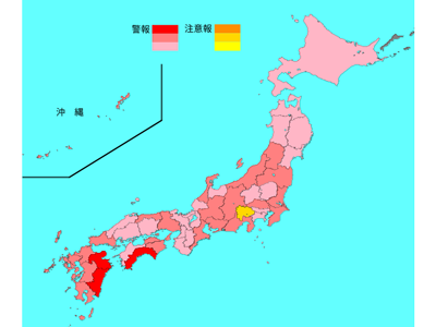 全国の保健所管轄区域で、警報レベルを超えている保健所管轄区域は201か所で、46都道府県に分布していた。また、注意報レベルを超えている保健所管轄区域は150か所で、40都道府県に分布していた。