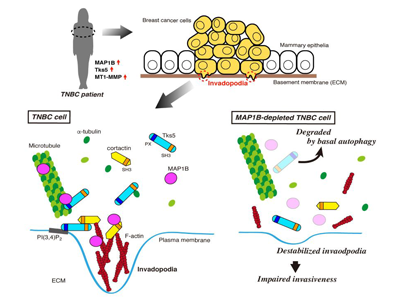 以上の結果から、MAP1Bは、TNBC細胞においてcortactinやTks5との相互作用を介して浸潤突起を正に制御しており、がんの浸潤転移を促進することが示唆された。