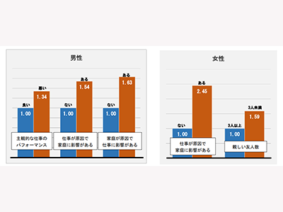 仕事のパフォーマンス低と自己評価の男性/親しい友人が少ない女性、問題飲酒多い傾向