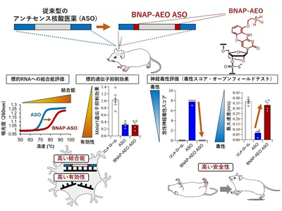 研究グループは新規の核酸分子の化学修飾技術である、2′,4′-BNA/LNA with 9-(aminoethoxy)phenoxazine(BNAP-AEO)を用いて、中枢神経疾患を標的としたASOの有効性および安全性の詳細な検証に着手した。BNAP-AEOは、核酸糖骨格部に対する化学修飾である2′,4′-BNA/LNAと、塩基に対する化学修飾である9-(aminoethoxy)phenoxazineを組み合わせた技術で、研究グループはこれまでにBNAP-AEOを導入した核酸分子が標的RNAへの高い結合能を有することを報告している。