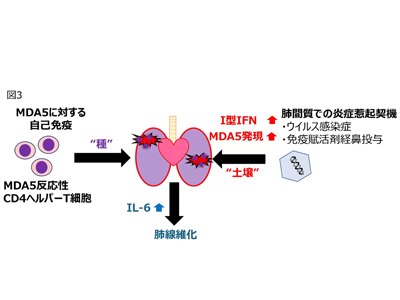 自然免疫活性化が「土壌」MDA5特異的CD4T細胞が「種」、+IL-6で間質性肺炎