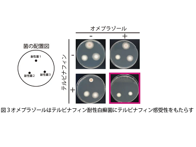 Ptk2は、細胞膜上のプロトンポンプPma1を活性化することが知られている。白癬菌のTrPtk2もプロトンポンプPma1を活性化し、テルビナフィン耐性をもたらすのではないかと考え、プロトンポンプ阻害剤として知られる胃酸抑制薬オメプラゾールを作用させた際のテルビナフィン感受性を確認した。その結果、テルビナフィン耐性白癬菌においてテルビナフィンに部分的な感受性を示すことがわかった。