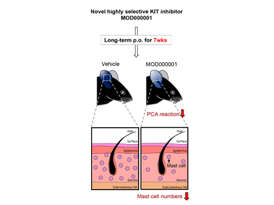 マウス骨髄由来培養マスト細胞とヒト末梢血幹細胞由来培養マスト細胞を用いた実験により、MOD000001が、SCF(KIT受容体に結合し活性化する生体内分子)やアレルゲンによるマスト細胞の活性化や生存の延長、マスト細胞の遊走活性などを顕著にかつ特異的に阻害することが示された。また、マウスじんましんモデルを用いた実験によって、MOD000001の経口投与が、アレルゲンによって惹起されるじんましんを著明に軽減することが見出された。さらに、MOD000001の長期経口投与によりマウス皮膚におけるマスト細胞数の減少も確認された。なおMOD000001の長期投与によるマウスへの副作用は観察されなかった。