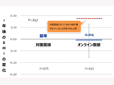 1年間のBMIの変化は、対面面接群ではベースライン時の27.61から1年後に27.42、オンライン面接群では27.68から27.48に減少していた。オンライン面接は対面面接と比較して、BMIの変化量が0.014ほど多く減量していたが、統計学的には有意な差ではなかった(p=.847)。またこの際に、統計学的に算出した信頼区間の上限は、事前に検討した非劣性マージンを下回っていた。