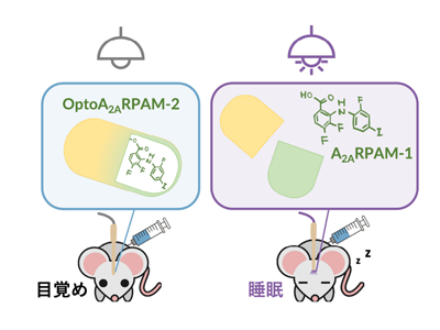 これを野生型マウスに腹腔内投与した後、光ファイバーを介して側坐核に可視光(λ>400nm)を照射したところ、覚醒期におけるマウスの睡眠時間を1.7倍に増加させることに成功した。この効果は、A2AR欠損マウスや側坐核以外の脳領域への光照射では観察されなかった。