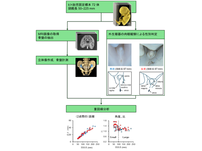 ヒト胎児の性別は外生殖器の肉眼観察から判定した。肉眼観察を用いた正確な性別判定は、頭殿長50mmの大きさの胎児から十分に可能である。この研究では、頭殿長が50mmから225mmまでのヒト胎児標本72体(男児;34体、女児;38体)のMRI画像を、前臨床用7Tおよび臨床用7T、3TMRI装置を用いて取得した。作成した骨盤の立体像から、解剖学的特徴をもつ2点間の距離や角度を21か所測定した。また、距離のデータを用いて計20個の比を算出した。これらの計測結果と重回帰分析を用いて性差を検討した。