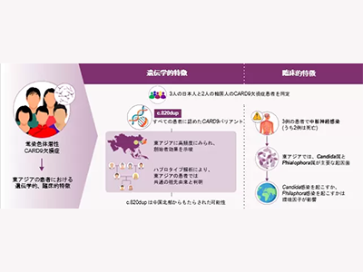 今回の研究では、表在性および侵襲性のCandida albicans感染症に罹患した日本人患者2人でCARD9バリアントを同定し、CARD9欠損症と診断した。両患者は、既報告のもう一人の日本人患者と2人の韓国人患者と同様にc.820dupバリアントを保有。1塩基多型(single nucleotide polymorphism:SNP)を用いたハプロタイプ解析により日本人、韓国人、中国人の患者は10kbのハプロタイプが一致していることが確認された。