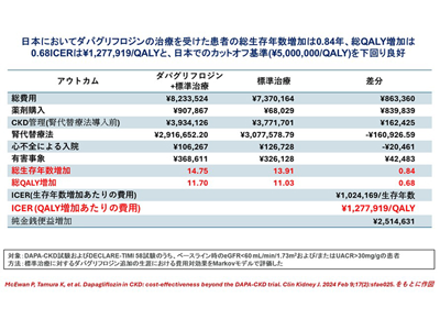 その結果、SGLT2阻害薬ダパグリフロジンの投与により慢性腎臓病の進行が抑制され、日本では予測余命が0.84年延長(14.75年対13.91年)すると推定され、英国、スペイン、イタリアでも同様の推定結果が得られた。臨床上の改善効果として、各国で0.45~0.68年の平均質調整生存年(QALY)上の利益に相当すると評価された。そして、費用対効果の評価では、質調整生存年(QALY)獲得あたりの増分費用効果比(ICER)を推定し、例えば日本では、ICERが<500万円/QALYであれば、費用対効果が高いと判断される。今回の研究では、日本、英国、スペイン、イタリアにおけるICERは、それぞれ1万3,723ドル/QALY (127万7,919円/QALY)、1万676ドル/QALY、1万4,479ドル/QALY、7,771ドル/QALYであったことから、国別の支払い意思閾値において費用対効果に優れることが明らかになった。さらに、サブグループ解析では、ダパグリフロジンは尿中アルブミン/クレアチン比や2型糖尿病の状態にかかわらず費用対効果が高いことが示唆され、これらの結果から国内CKD治療薬として初承認されたSGLT2阻害薬ダパグリフロジンは費用対効果的にも優れることが明らかにされた。