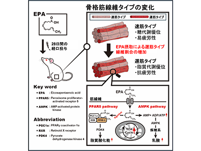 以前、研究グループは、食餌性の魚油摂取がラットにおいて筋線維タイプを遅筋方向へ移行することを報告している。しかし、その詳細なメカニズムは明らかになっていなかった。そこで今回の研究では、魚油に含まれる特徴的な脂肪酸に着目し、ラットの骨格筋線維タイプ、骨格筋機能や全身代謝に対する作用やその機序を明らかにすることを目的とした。