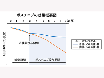 探索的評価として実施したJaCALSデータとの比較において、ボスチニブの有効性が示唆された。また、ALSのバイオマーカーである血漿中ニューロフィラメントL(NFL)値は、発症後は平均すると一定の値で推移することが過去のレビュー論文で報告されている。同治験においては、血漿中NFLの値を観察期間(ボスチニブ投与開始前)と治験薬投与期間で測定したところ、治験薬投与後、患者のNFLの平均値が治験薬投与前の平均値よりも低下していた。しかし、観察期間にNFLの自然低下を示した患者もいたことから、このNFLの値の推移については今後の解析により慎重に検討するとしている。さらに、ボスチニブの24週間の投与において、探索的に行った評価において、第1相試験の結果と同様に以下のように一部の患者でALSの進行の抑制が認められる結果が得られた。