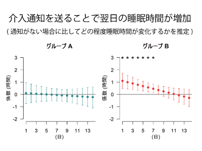 実際に、通知を送った場合では受け取らなかった場合に比べて最大で1時間程度睡眠時間が増加することが示された。加えて、元来睡眠の乱れが顕著であった集団においては睡眠時間の安定性が改善したことも確認された。