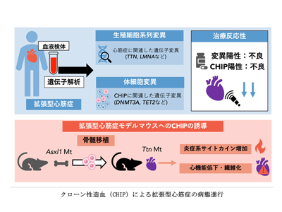 心不全はさまざまな原因疾患により心臓の機能が落ちることで、息切れなどを生じる状態を指し、日本の心疾患死因の第1位(約4割を占める)に位置している。心不全の原因となる病気の中でも、拡張型心筋症は心臓移植を必要とする最も重症な心不全の原因として日本では第1位を占めている。拡張型心筋症は他の心臓の病気よりも発症年齢が若く、血縁者にも発症が多く見られることから発症と進行に遺伝的な要因の関与が強い病気である。これまでに遺伝的な要因を有する拡張型心筋症は重症化しやすく、予後が不良であると報告されていた。しかし、拡張型心筋症の経過は生まれ持った遺伝的要因のみによって決定されるわけではなく、後天的な要因も関与する。血液細胞の後天的な変異として生じるクローン性造血はこの後天的な要因の候補の一つだが、拡張型心筋症の経過にどのように影響を与えるかは十分に明らかになっていない。